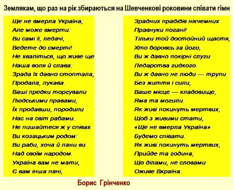 Одним із найяскравіших творів Грінченка є вірш «Землякам, що раз на рік збираються на Шевченкові роковини співати гімн» (1898 р.), в якому поет висловив своє бачення ставлення української псевдоінтелігенції до України.